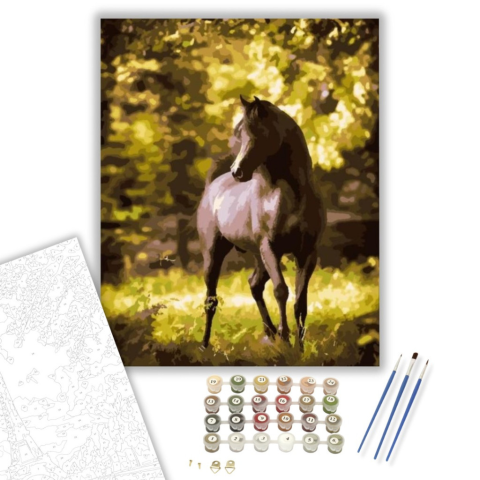 Paripa - számfestő készlet – 40×50 cm (Keretre feszítve) A festményen megjelenő paripa eleganciája és szabadsága szinte tapintható, magával ragadva a nézőt egy mesés világba. Egy rejtélyes történet bontakozik ki, ahol a természet és az állat közötti harmó