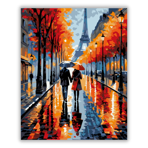 Párizsi Őszi Séta - számfestő készlet – 40×50 cm (Keret nélkül) A festmény egy párt ábrázol, amint kéz a kézben sétálnak a fénylő párizsi utcán, miközben a lámpák fényei tükröződnek a nedves macskaköveken. A kép domináns narancs és kék színei meleg, benső