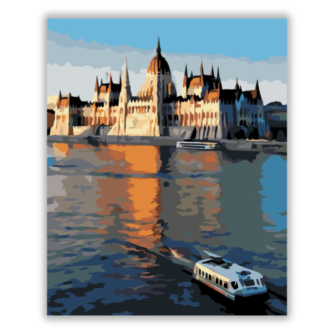Parlament a Duna-parton - számfestő készlet – 40×50 cm (Keret nélkül) A festmény a Parlament épületét ábrázolja a Duna partján, ahogy a lenyugvó nap aranyló fényei megvilágítják. A színek meleg narancs és arany árnyalatokkal ragyognak, melyek tükröződnek