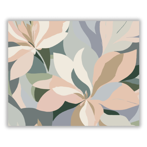Pasztell Virágszirmok és Textúrák - számfestő készlet – 40×50 cm (Keret nélkül) Ez a festmény átfedő virágszirmokat ábrázol áttetsző akvarell tónusokban, mint például zsályazöld, rózsaszín, halvány levendula és arany bézs. A kompozíció lágy mozgást és har