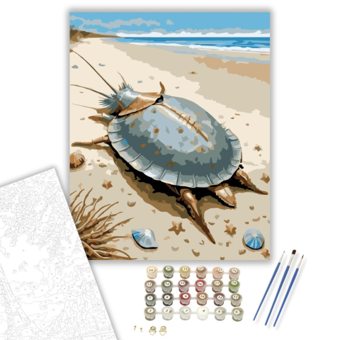Patkórák a Tengerparton - számfestő készlet – 40×50 cm (Keretre feszítve) A festmény egy patkórákot ábrázol, amint lassan halad a homokos tengerparton, apró kagylókkal a hátán. A kép színvilága a homok és az óceán kék árnyalataiban pompázik, nyugodt és te