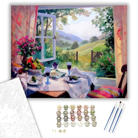 Pazar táj - számfestő készlet – 40×50 cm (Keretre feszítve) A festmény egy meghitt, békés reggel hangulatát idézi, ahol a természet közelsége és a friss levegő szinte tapintható. Egy történet bontakozik ki az ablakon át elénk táruló tájról és a megterítet