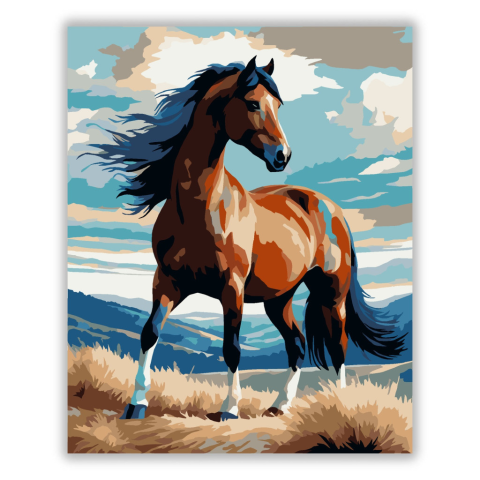 Pej Csődör a Dombtetőn - számfestő készlet – 40×50 cm (Keret nélkül) A festmény egy pej csődört ábrázol, amint egy dombtetőn áll, figyelve a távoli mezőket, miközben a szél játszik sörényével. A kép gazdag barna, kék és zöld árnyalatokkal dolgozik, amelye