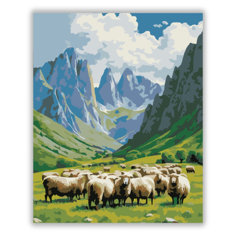 Picos de Europa Hegyi Táj - számfestő készlet – 40×50 cm (Keret nélkül) A festmény a Picos de Europa hegyeit ábrázolja zöld legelőkkel, legelésző juhokkal és sziklás csúcsokkal a gyorsan mozgó felhők alatt. A színek élénk zöldek és szürkék, melyek dinamik