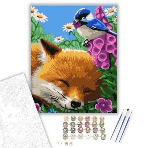 Pihenő róka - számfestő készlet – 40×50 cm (Keretre feszítve) A festmény derűs és békés hangulatot áraszt, mely a nézőt egy nyugodt, mesebeli világba repíti. Egy elbűvölő történet bontakozik ki a kép előtt, ahol az állatok harmóniában élnek a természet öl