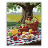 Piknik az Öreg Tölgy Árnyékában - számfestő készlet – 40×50 cm (Keret nélkül) A festmény egy pikniket ábrázol kockás pléden, amelyen friss szendvicsek, szőlő, limonádé és egy kosárnyi alma látható az öreg tölgy árnyékában. A színek élénkek és vidámak, a j