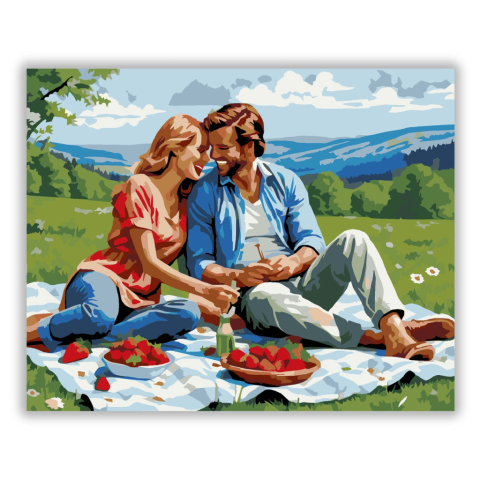 Piknikező Szerelmespár - számfestő készlet – 40×50 cm (Keret nélkül) A festmény egy szerelmespárt ábrázol, amint egy piknik takarón ülnek a tavaszi réten, epret eszegetve és nevetgélve a szabad ég alatt. A kép élénk zöld, piros és kék színei vidám és fris