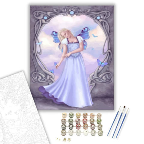 Pillangó szárnyakkal - számfestő készlet – 40×50 cm (Keretre feszítve) A festmény egy álomszerű világba repíti a nézőt, ahol a pillangók szárnyán szálló nő alakja misztikus történetet mesél el. A lila és kék árnyalatok nyugalmat és harmóniát sugároznak, m
