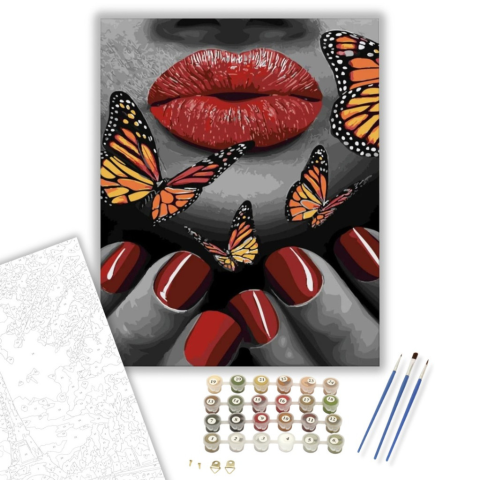 Pillangós száj - számfestő készlet – 40×50 cm (Keretre feszítve) Ez a festmény egy varázslatos világba kalauzol, ahol az érzékiség és a szabadság találkozik. A pillangók és az élénk színek egy történetet mesélnek el a szépségről és az átalakulásról. A kon