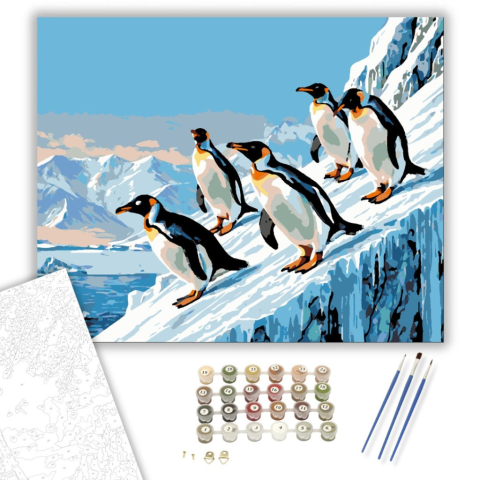 Pingvinek Jégpalotában - számfestő készlet – 40×50 cm (Keretre feszítve) A zord Antarktiszi tájon öt csodálatos pingvin méltóságteljesen sétál az örök hó és jég birodalmában. A háttérben a havas hegycsúcsok magasodnak a végtelen óceán fölé, a tájat lenyűg