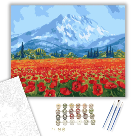 Pipacs Rét - számfestő készlet – 40×50 cm (Keretre feszítve) Ez a festmény egy nyugodt, mégis élénk hangulatot áraszt, amely azonnal magával ragadja a nézőt. Egy végtelen pipacsmező tárul elénk, melynek hátterében titokzatos hegyek magasodnak. A vörös és