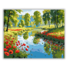 Pipacsok a Folyóparton - számfestő készlet – 40×50 cm (Keret nélkül) A festmény egy festői folyóparti rétet ábrázol, ahol élénkpiros pipacsok nőnek a lágyan folyó víz mellett. A színek kontrasztja, a piros virágok és a zöld háttér nyugodt, reggeli hangula