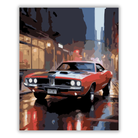 Piros Klasszikus Dodge Charger Éjszakai Városi Utcán - számfestő készlet – 40×50 cm (Keret nélkül) A festmény egy piros klasszikus Dodge Charger autót ábrázol, amely egy esős, éjszakai városi utcán parkol. A nedves aszfalt tükrözi az autó fényét, meleg és