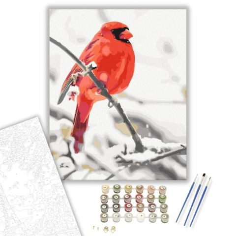 Piros Madár - számfestő készlet – 40×50 cm (Keretre feszítve) A kép vibráló energiát áraszt, ahogy a piros madár a téli tájban megpihen. A festmény egy csendes pillanatot örökít meg, ahol a természet szépsége és a madár élénksége találkozik. A kontrasztos