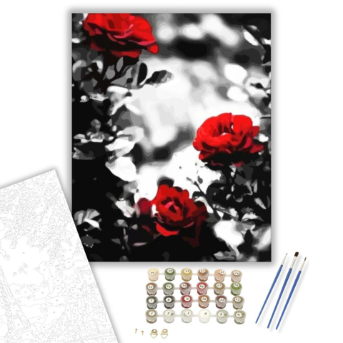 Piros-szürke rózsák - számfestő készlet – 40×50 cm (Keretre feszítve) A kép drámai hangulatot áraszt, mintha egy titokzatos kertbe pillantanánk be. A vörös rózsák mesélnek a szenvedélyről és az időtlen szépségről. A fekete-fehér háttér kiemeli a virágok é