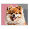 Pomerániai Törpespicc Vidám Portré - számfestő készlet – 40×50 cm (Keret nélkül) A festmény egy játékos pomerániai törpespiccet ábrázol, amint vidáman néz a kamerába, rózsaszín háttér előtt. A meleg barna és krémszínű árnyalatok barátságos és élénk hangul