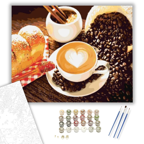 Presszó kávé - számfestő készlet – 40×50 cm (Keretre feszítve) Készíts gyönyörű műalkotásokat, előzetes festő tudás nélkül! Éld át az alkotás gyönyörű pillanatait és varázslatos hangulatát! Akkor is gyönyörű festményeket hozhatsz létre, ha még nem festett