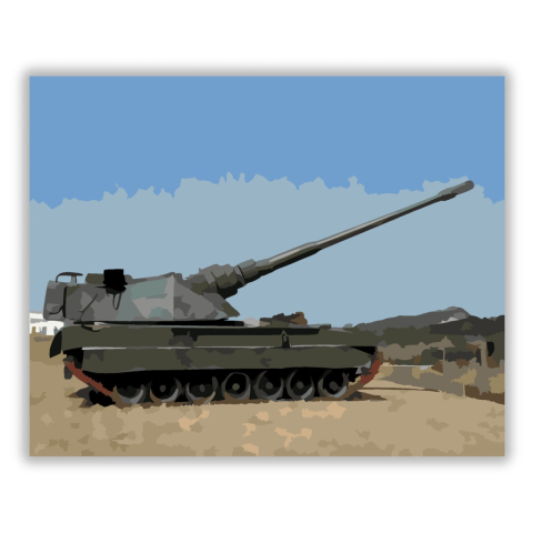 PzH 2000 Önjáró Tüzérségi Ágyú - számfestő készlet – 40×50 cm (Keret nélkül) A festmény egy PzH 2000 önjáró tüzérségi ágyút ábrázol, amely nyugodt mezőn áll. A kép színvilága zöld és barna árnyalatokkal dolgozik, harmonizálva a háttér kék égboltjával. A k