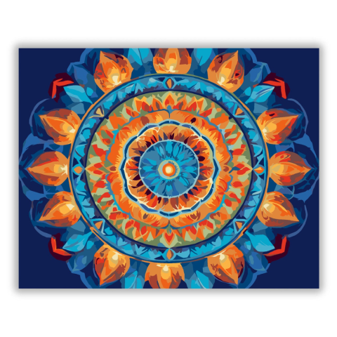 Ragyogó Többrétegű Mandala - számfestő készlet – 40×50 cm (Keret nélkül) A festmény egy többrétegű, részletgazdag mandalát ábrázol, amelynek áttetsző formái egymásra rétegződnek. Az élénk narancs, kék és zöld színek misztikus, lebegő hatást keltenek. A ké
