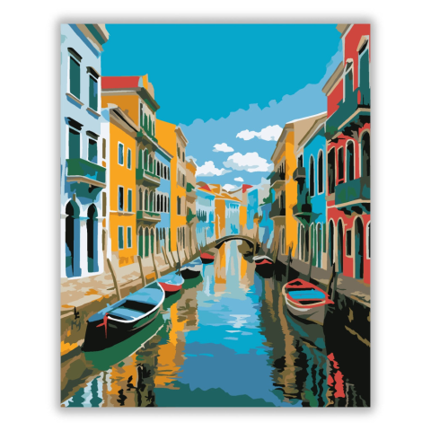 Recife Koloniális Csatornái - számfestő készlet – 40×50 cm (Keret nélkül) A festmény Recife csatornáit ábrázolja, amelyeket élénk színű, koloniális épületek szegélyeznek. A vízen tükröződő színek és a napfényes égbolt mediterrán hangulatot sugároznak. A k
