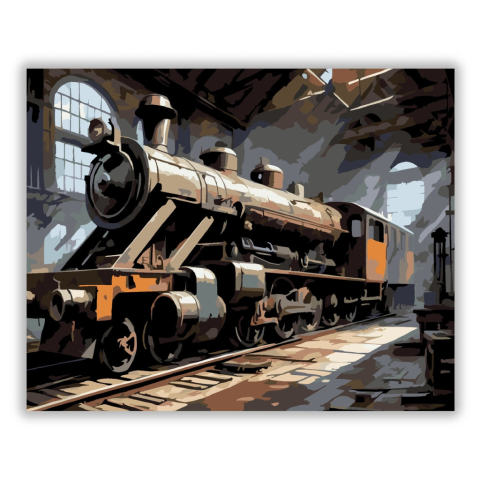 Régi Mozdony Műhelyben - számfestő készlet – 40×50 cm (Keret nélkül) A festmény egy régi vasúti műhely belsejét ábrázolja, ahol egy mozdony áll. A kép ipari világítással és drámai árnyékokkal játszik, kiemelve a fémes és olajfoltos felületeket. A mű remek
