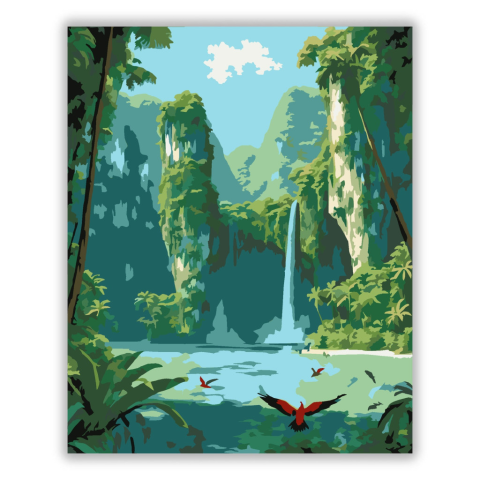 Rejtett Lagúna Vízeséssel - számfestő készlet – 40×50 cm (Keret nélkül) A festmény egy varázslatos lagúnát ábrázol, ahol mesés vízesések zúdulnak a türkizkék vízbe, és egzotikus madarak repkednek a buja dzsungel fái között. Élénk színek és vibráló hangula
