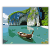 Rejtett Öböl és Fa Halászhajó - számfestő készlet – 40×50 cm (Keret nélkül) A festmény egy rejtett öblöt ábrázol, ahol a smaragdzöld víz találkozik a hófehér homokos parttal és magas mészkő sziklákkal. A kép élénk zöld és kék árnyalatokban pompázik, melye