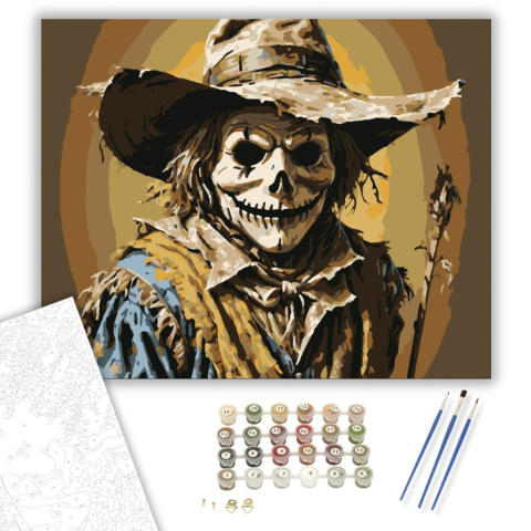 Rémisztő madárijesztő - számfestő készlet – 40×50 cm (Keretre feszítve) Ez a hátborzongató festmény egy rémisztő madárijesztőt ábrázol, melynek koponyaszerű maszkja igazán kísérteties hatást kelt. A kép színei a sárgás és barnás árnyalatokban mozognak, am