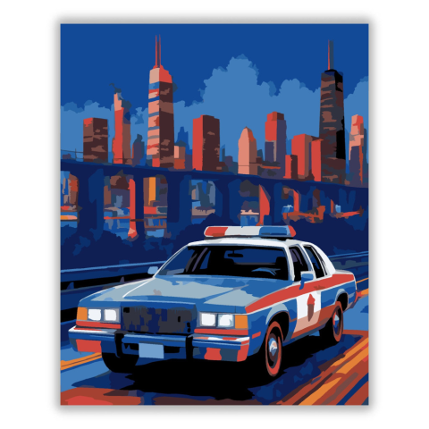 Rendőrautó és Városi Fények - számfestő készlet – 40×50 cm (Keret nélkül) A festmény egy rendőrautót ábrázol, amely az út szélén áll, miközben a háttérben a város fényei ragyognak. A kék és piros színek dominálnak, a fények és árnyékok kontrasztjai dinami