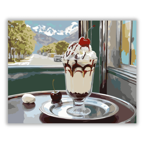 Retro Fagylaltkehely Cseresznyével - számfestő készlet – 40×50 cm (Keret nélkül) A festmény egy vintage fagylaltkelyhet ábrázol, amely vaníliás fagylalttal, tejszínhabbal, cseresznyével és csokoládéöntettel van díszítve, egy ezüsttálcán tálalva. A háttérb