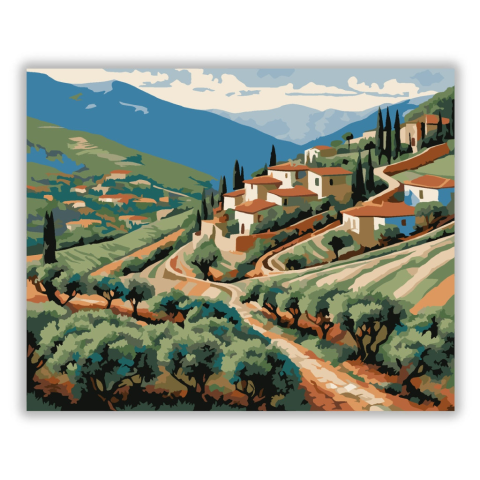 Rif-hegység Faluja - számfestő készlet – 40×50 cm (Keret nélkül) A festmény a Rif-hegységben található tájat ábrázolja, ahol terrakotta tetős kis falvak bújnak meg a zöldellő hegyoldalakon. A kompozíciót a gazdag zöld és földszínek uralják, meleg, termész