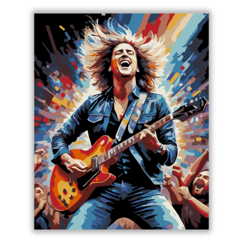 Rock Zenész Koncerten - számfestő készlet – 40×50 cm (Keret nélkül) A festmény egy híres rockzenészt ábrázol előadás közben, lobogó hajjal és gitárral a kezében. A háttérben absztrakt fényhatások és ünneplő tömeg látható, ami dinamikus és energikus hangul