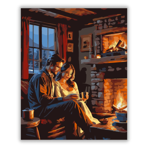 Romantikus Est Kandallóval - számfestő készlet – 40×50 cm (Keret nélkül) A festmény egy párt ábrázol, amint egy hangulatos kabinban ülnek a kandalló mellett, kezükben forró italokkal. A meleg narancssárga és barna árnyalatok a tűz fényében ragyogó, meghit