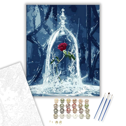 Rózsa üvegben - számfestő készlet – 40×50 cm (Keretre feszítve) A kép misztikus és varázslatos hangulatot áraszt, mintha egy mesebeli történet részese lennénk. Egy titokzatos világba vezet, ahol a szépség és a törékenység találkozik. A kék és piros kontra