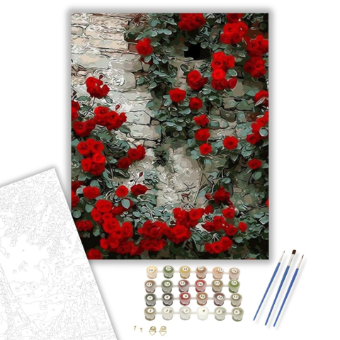 Rózsafal - számfestő készlet – 40×50 cm (Keretre feszítve) A kép romantikus hangulatot áraszt, mintha egy titkos kertbe vezetne. A vörös rózsák buja burjánzása egy elfeledett történetet mesél el, ahol a természet visszahódítja a teret. A zöld és vörös szí