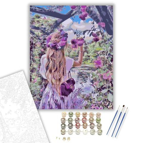 Rózsák között - számfestő készlet – 40×50 cm (Keretre feszítve) Ez a festmény egy varázslatos kert hangulatát idézi, ahol az idő megáll, és csak a pillanat számít. Egy titokzatos alak sétál a rózsák között, mintha egy mesebeli világ része lenne. A lila és