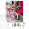 Rózsaszín bicikli - számfestő készlet – 40×50 cm (Keretre feszítve) A festmény egy nosztalgikus hangulatot áraszt, amely a városi romantikát idézi fel. Egy történet bontakozik ki a kép előtt, ahol a rózsaszín bicikli és a virágok találkozása egy elfeledet