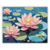 Rózsaszín Lótusz és Szitakötők a Víz Felszínén - számfestő készlet – 40×50 cm (Keret nélkül) A festmény rózsaszín lótuszvirágokat ábrázol, amelyek nyugodt vízen úsznak, körülöttük szitakötők és apró arany szikrák. A pasztell színek és a finom részletek va