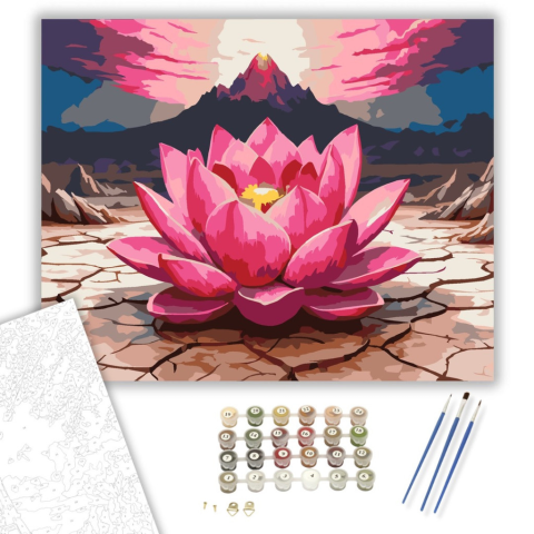 Rózsaszín Lótusz Száraz Földön - számfestő készlet – 40×50 cm (Keretre feszítve) A festmény egy ragyogó rózsaszín lótuszvirágot ábrázol, amely repedezett száraz földből nő ki, szimbolizálva a belső békét és spirituális erőt a szenvedésből való felemelkedé