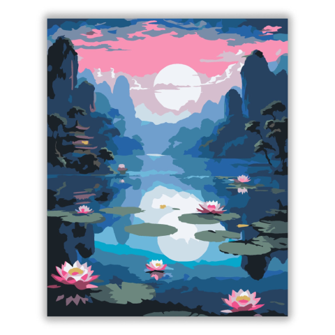 Rózsaszín Lótuszok Holdfényes Tavon - számfestő készlet – 40×50 cm (Keret nélkül) A festmény nyíló rózsaszín lótuszvirágokat ábrázol, amelyek egy csendes, holdfényes tavon lebegnek. A háttérben magas sziklák és egy pagoda látható, rózsaszín és kék árnyala