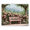 Rózsaszín Rózsabokor a Parkban - számfestő készlet – 40×50 cm (Keret nélkül) A festmény egy rózsaszín rózsabokrot ábrázol, amely átível egy rusztikus fa pad fölött egy békés parkban. A lágy pasztellszínek nyugodt és harmonikus hangulatot teremtenek. A kép