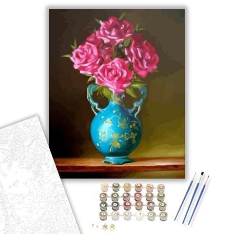 1 kép Számfestő.hu Rózsaszín virágok kék vázában - számfestő készlet – 40×50 cm (Keretre feszítve)