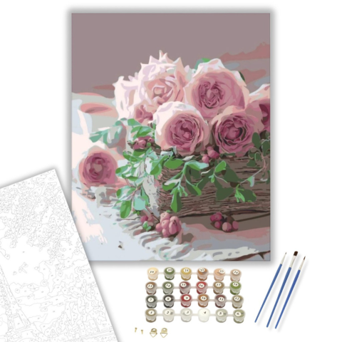 1 kép Számfestő.hu Rózsazsín rózsa kosárkában - számfestő készlet – 40×50 cm (Keretre feszítve)
