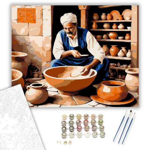 Safi Kerámiaművészete - számfestő készlet – 40×50 cm (Keretre feszítve) A festmény egy safi kerámiaművészt ábrázol, amint agyagtálat formáz egy korongon, körülötte kézzel festett tányérok és terrakotta vázák láthatók. A meleg földszínek és az agyag termés