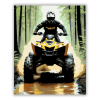 Sárga ATV az Erdei Ösvényen - számfestő készlet – 40×50 cm (Keret nélkül) A festmény egy sárga ATV-t ábrázol, amint egy erdei ösvényen száguld, miközben sár fröccsen a hatalmas kerekeiről. A háttérben a zöld erdő ködbe burkolózik, kontrasztot adva a jármű