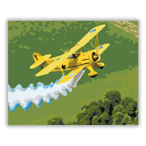 Sárga Kétfedeles Repülő Műrepülés Közben - számfestő készlet – 40×50 cm (Keret nélkül) A festmény egy élénksárga kétfedeles repülőt ábrázol, amely műrepülést hajt végre az égen, miközben füstcsíkot hagy maga után. A háttérben zöldellő mező látható, ami a