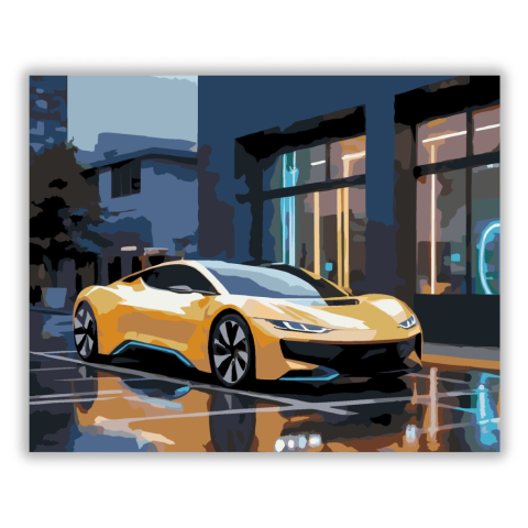 Sárga Modern Sportautó Neon Fényekkel - számfestő készlet – 40×50 cm (Keret nélkül) A festmény egy sárga modern sportautót ábrázol, amely egy elegáns városi állomáson töltődik. A neon fények visszatükröződése a kocsi fényes felületén vibráló éjszakai atmo
