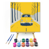 Sárga úton - gyerek számfestő készlet – 20×20 cm (Keretre feszítve) Ez a kép egy vidám, sárga autót ábrázol, amint egy napsütéses úton suhan a fák között. A ragyogó sárga színek és a játékos út hangulata mosolyt csal mindenki arcára. Tökéletes választás a