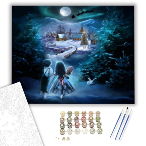 Sarki fény - számfestő készlet – 40×50 cm (Keretre feszítve) A festmény varázslatos, éjszakai hangulatot áraszt, amely azonnal magával ragadja a nézőt. Egy titokzatos történet bontakozik ki a képen, ahol két gyermek felfedező útra indul egy hóval borított