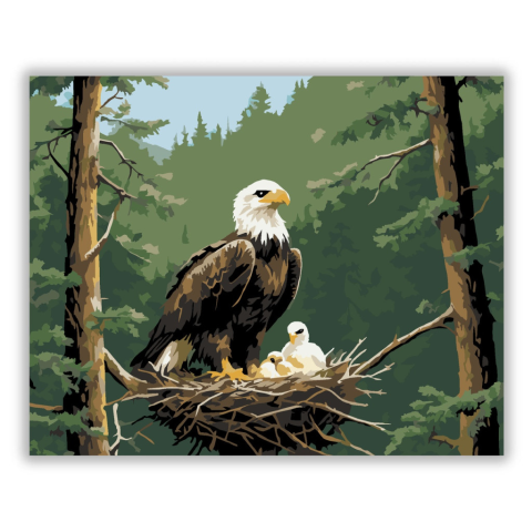 Sasfészek a Magasban - számfestő készlet – 40×50 cm (Keret nélkül) A festmény egy fészekben ülő sas családot ábrázol, magas fák között rejtőzve. A zöld és barna árnyalatok természetközeli, békés hangulatot sugallnak. A kép a családi kötelék erősségét és a